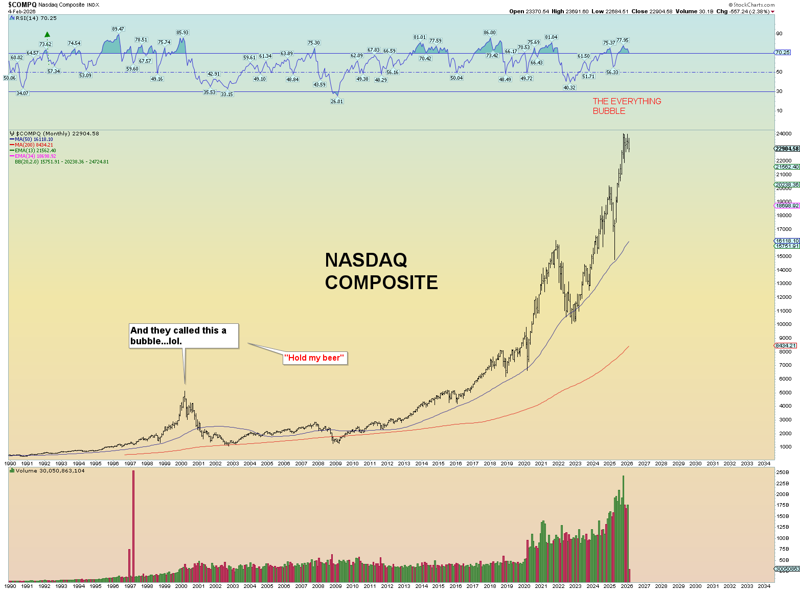 5 monthly candles in a row for the NASDAQ Composite that are near a top. From strong hands to weak. Still overbought on the monthly!