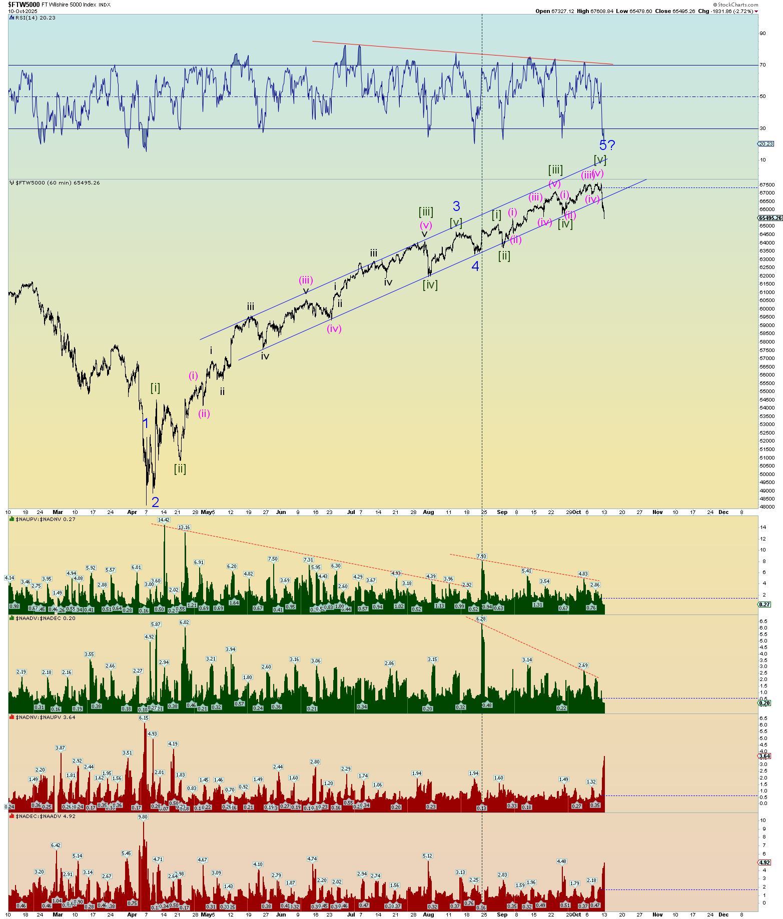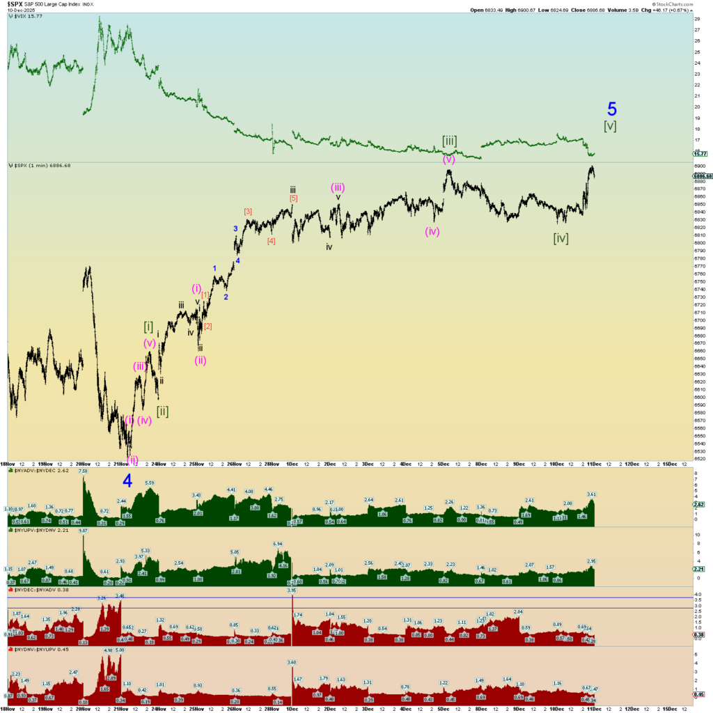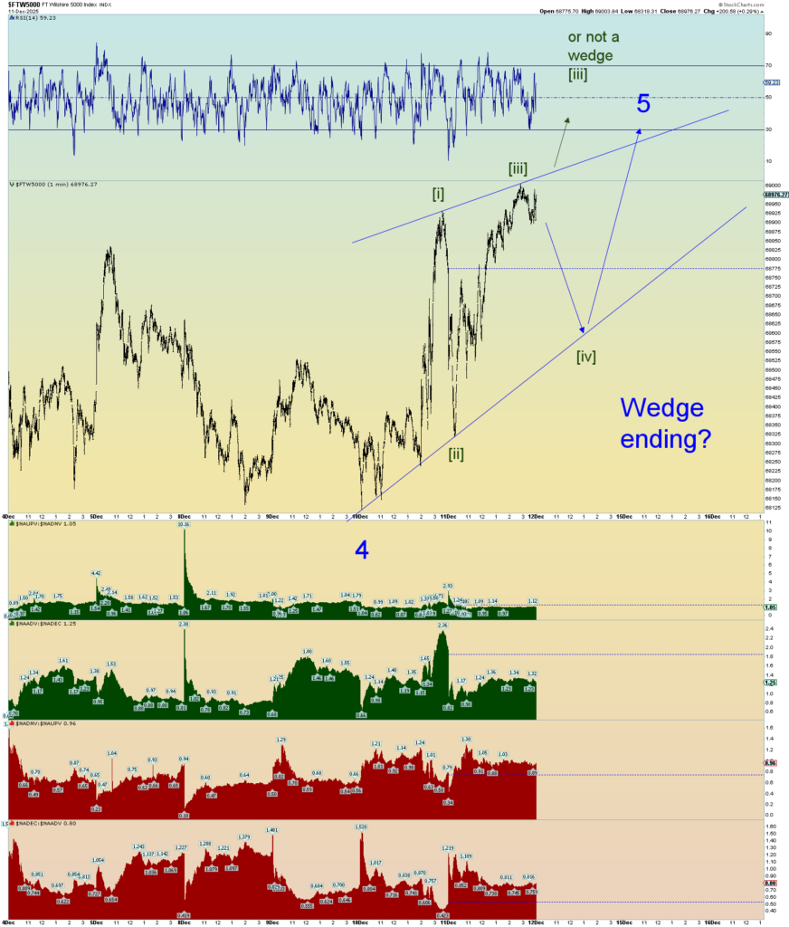 Possible squiggle counts going forward. Wedge maybe? The deep retrace of this morning head-faked everyone and then the surge of a wave [iii]. Seems “wedge-like” behavior near a top. Very herky jerky. Very curious to see what emerges tomorrow.