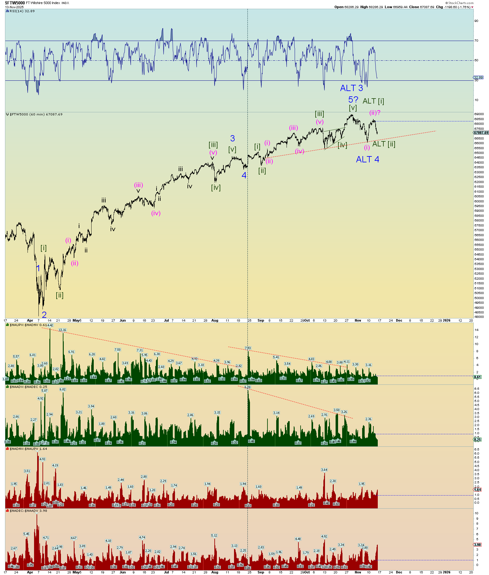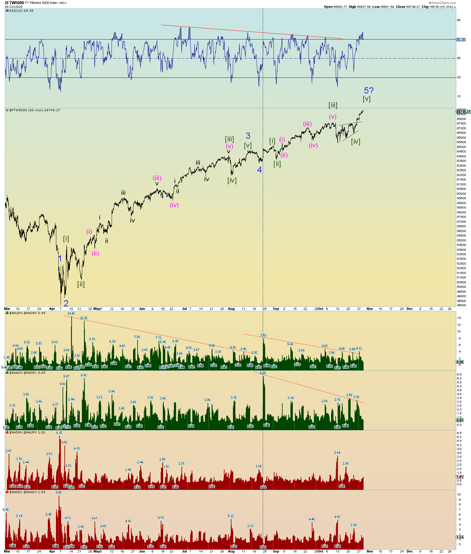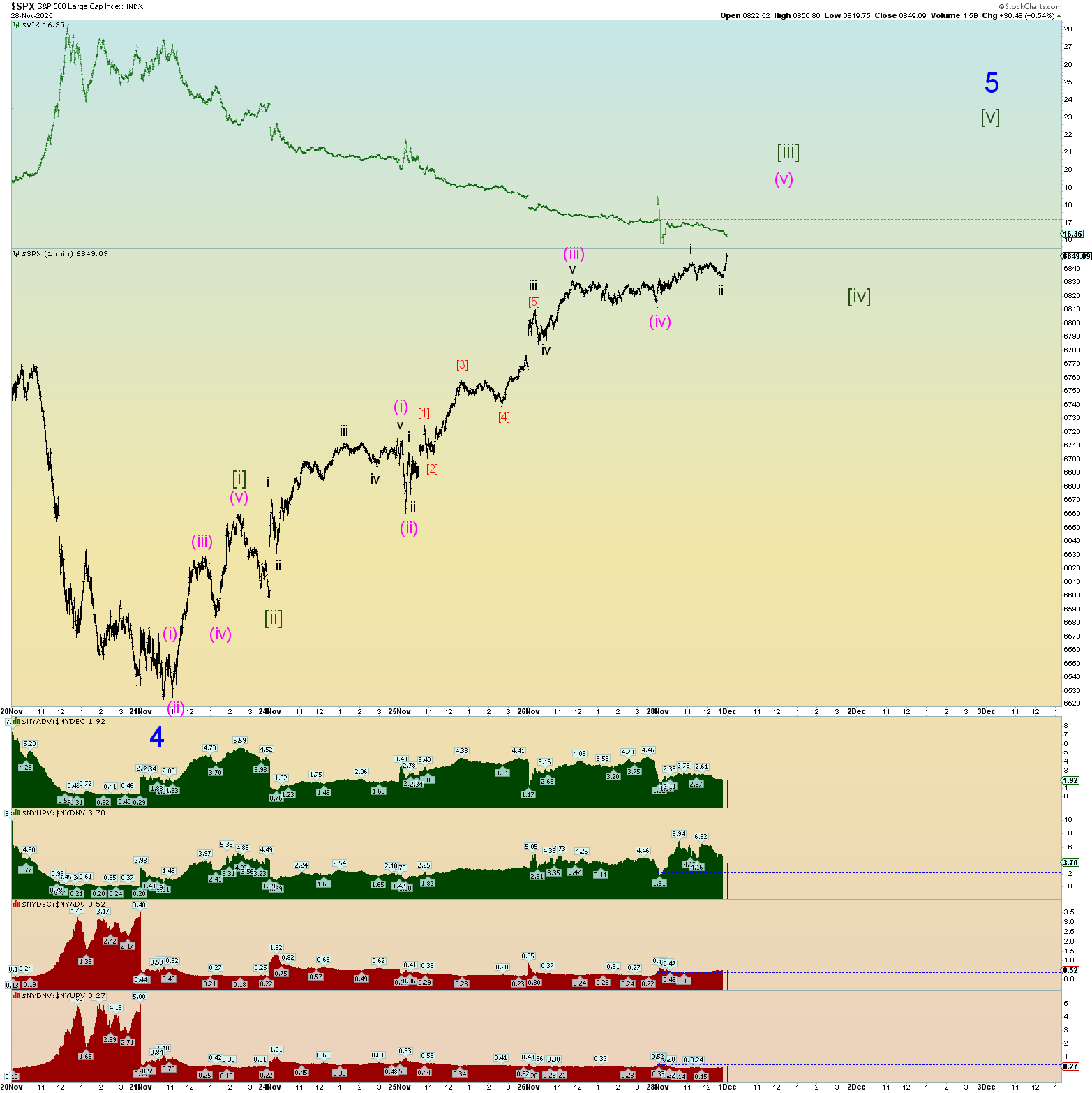 Possible squiggle counts going forward. Wedge maybe? The deep retrace of this morning head-faked everyone and then the surge of a wave [iii]. Seems “wedge-like” behavior near a top. Very herky jerky. Very curious to see what emerges tomorrow.