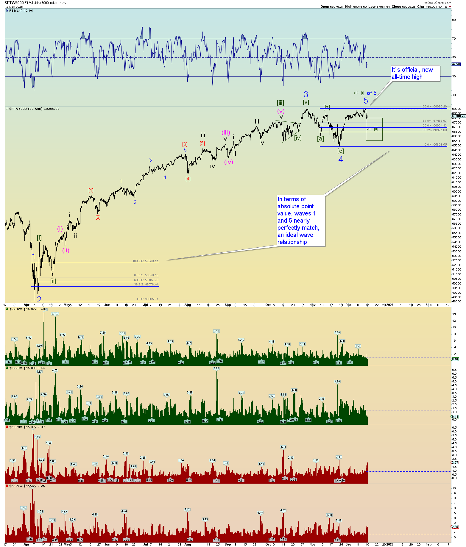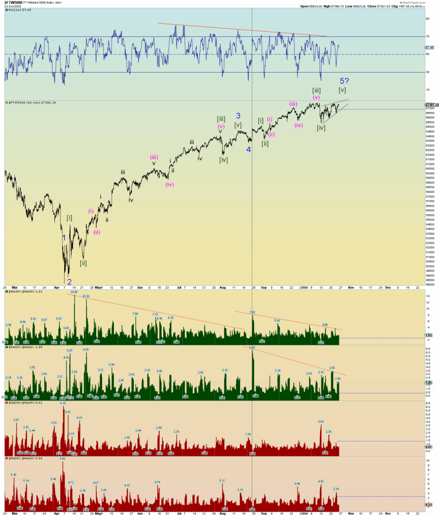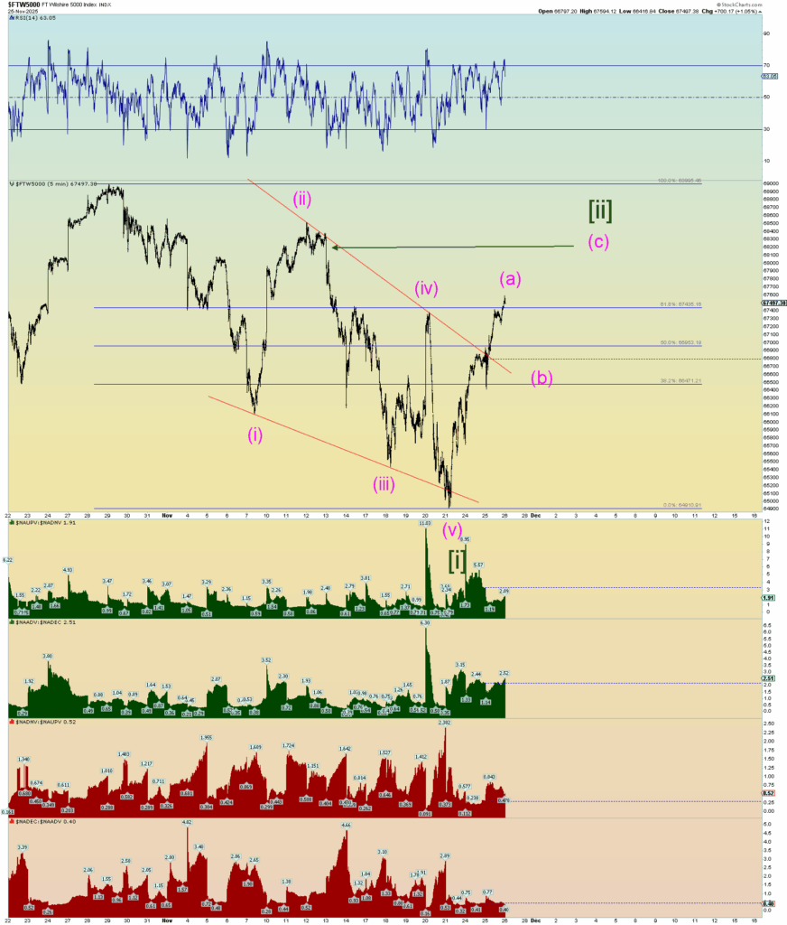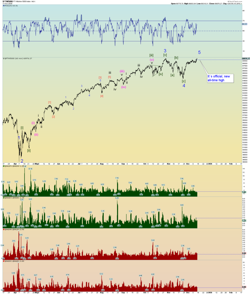Ok. Well, we got some real count confirmation today. The Wilshire 5000 reached a new all-time intra-day high. I mix in S&P 500 charts because these are equivalent charts although I prefer to use the Wilshire 5000 when parsing top and bottom ticks in squiggle counts.