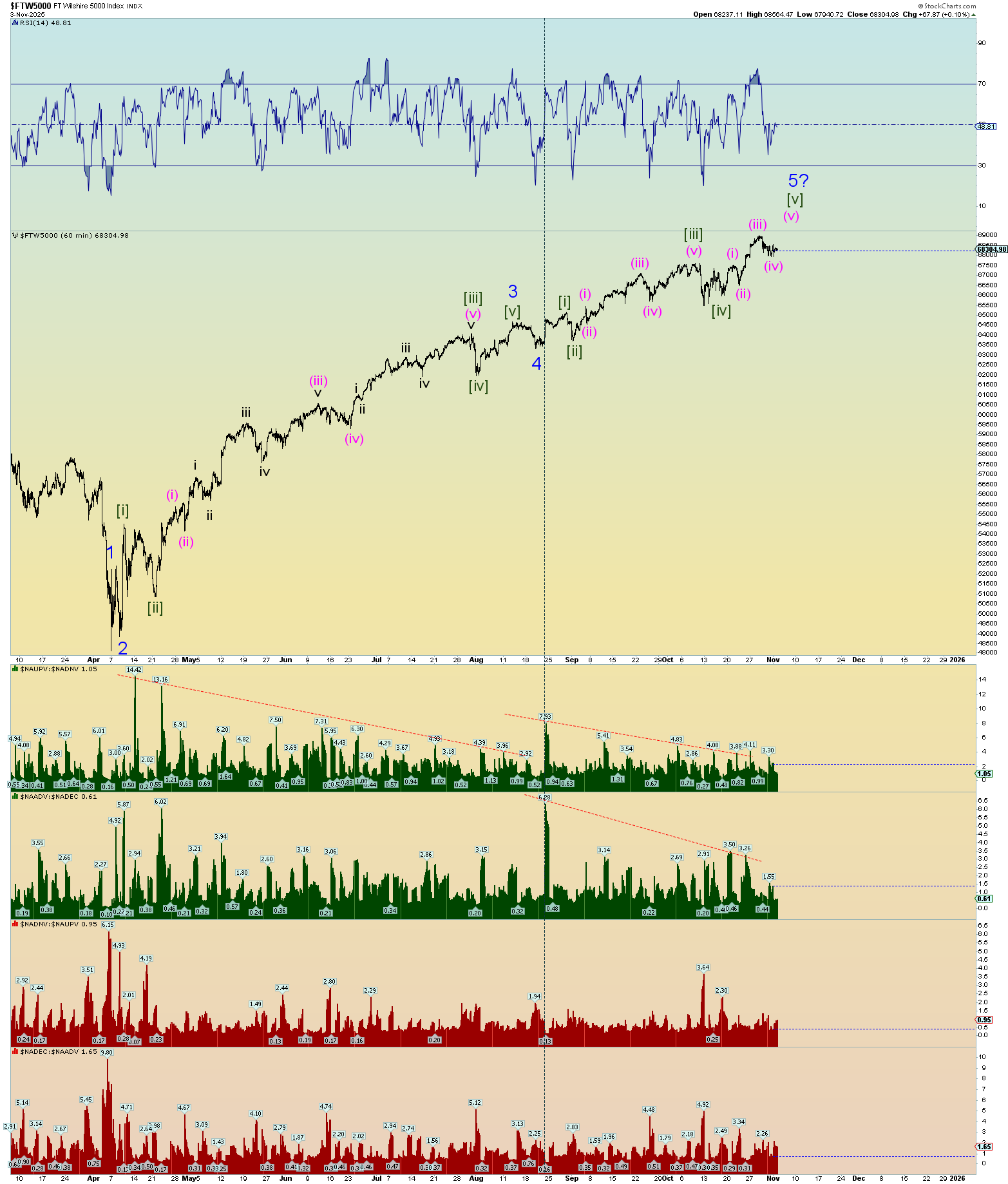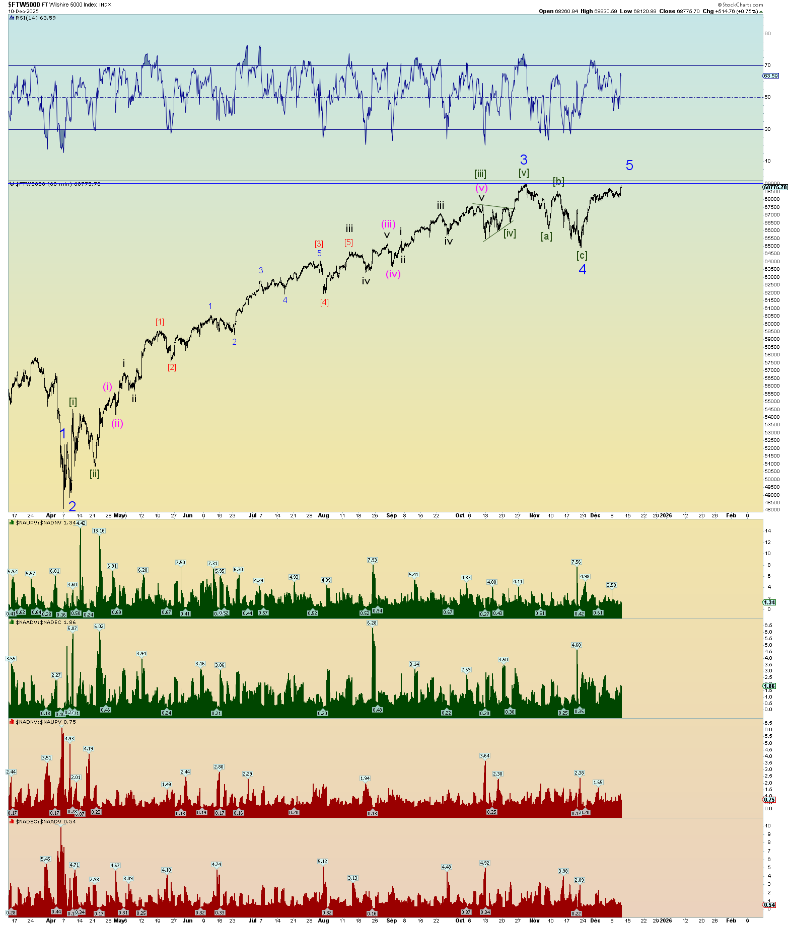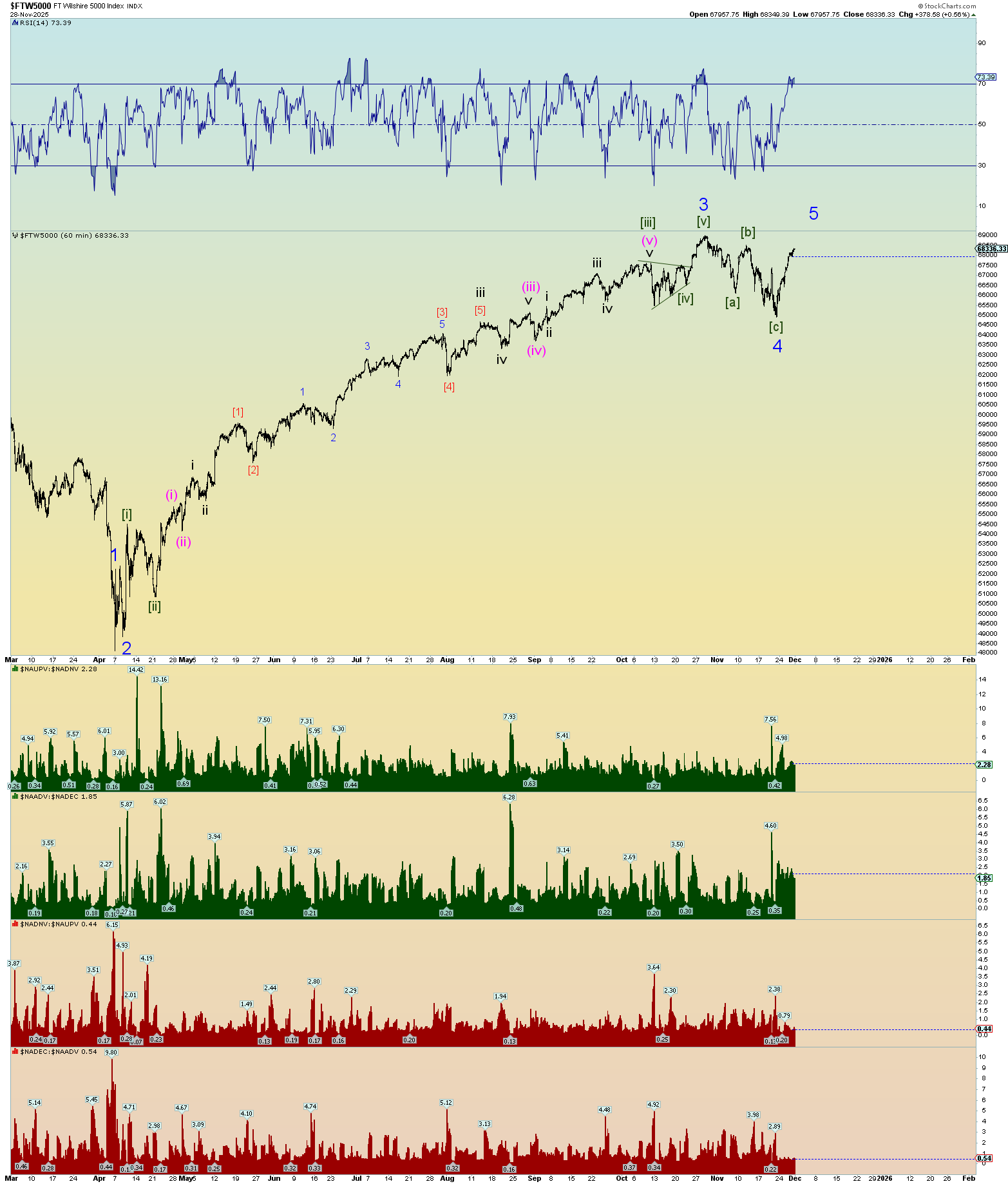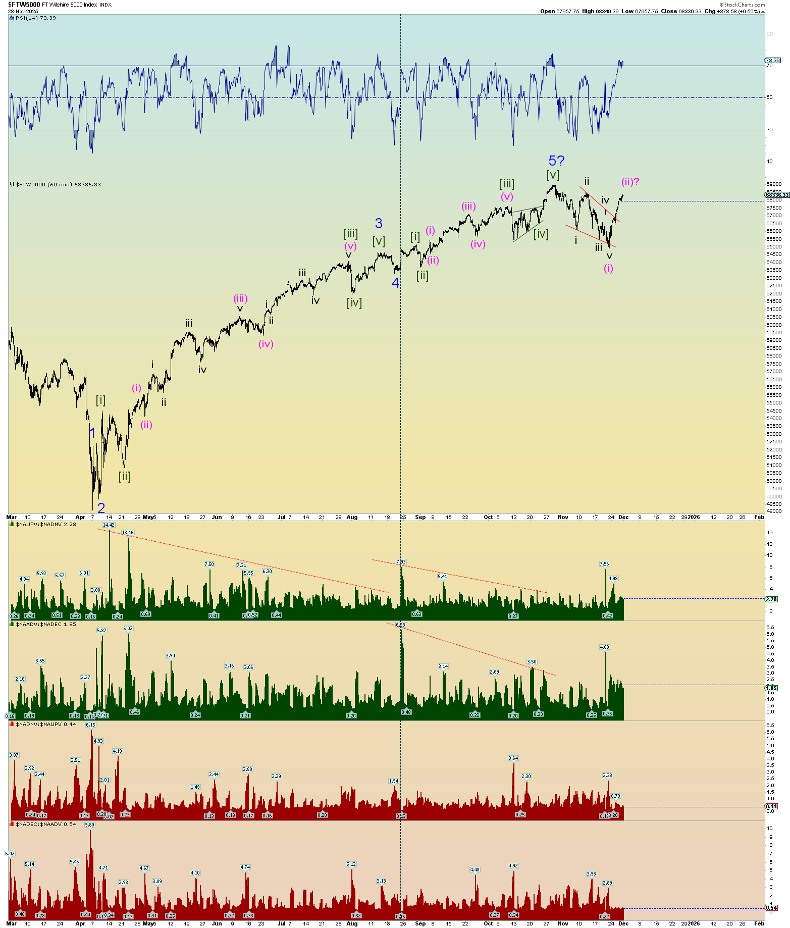 Ok. Well, we got some real count confirmation today. The Wilshire 5000 reached a new all-time intra-day high. I mix in S&P 500 charts because these are equivalent charts although I prefer to use the Wilshire 5000 when parsing top and bottom ticks in squiggle counts.