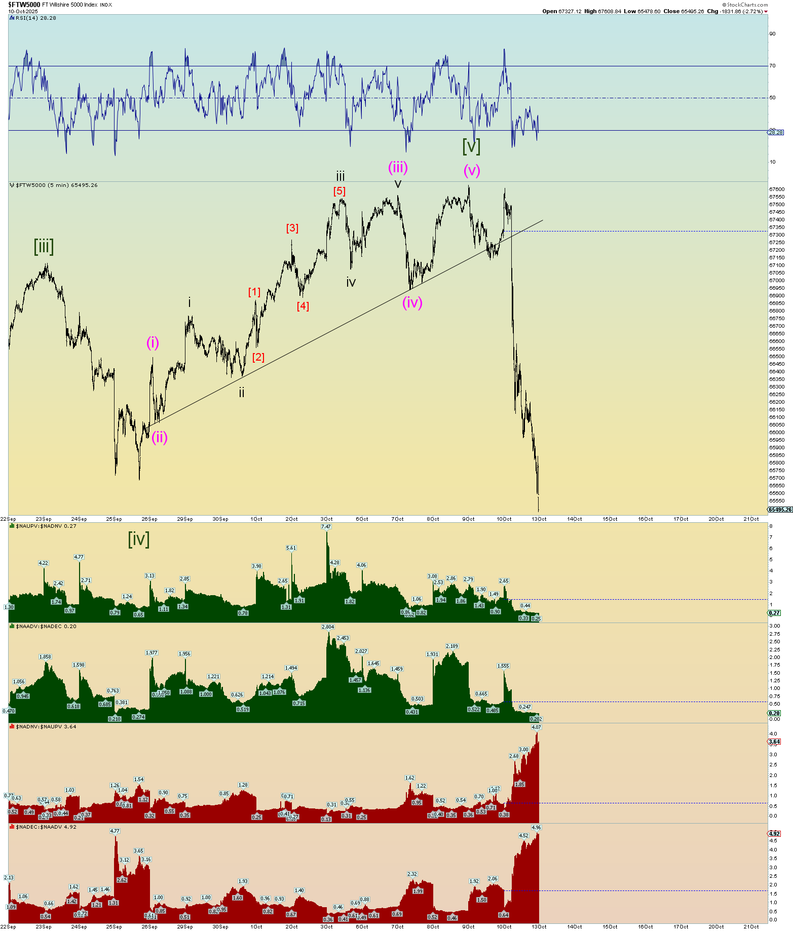 I’m only going to post the squiggle count tonight. The market neither went up to form a possible Minute wave [iii] of 5 of (5) of [5] nor did it park itself in a decline as a wave [iv] of 5 of an ending diagonal triangle as was proposed in the Wilshire 5000 3-minute chart last night as the decline was a new low over the past many days.