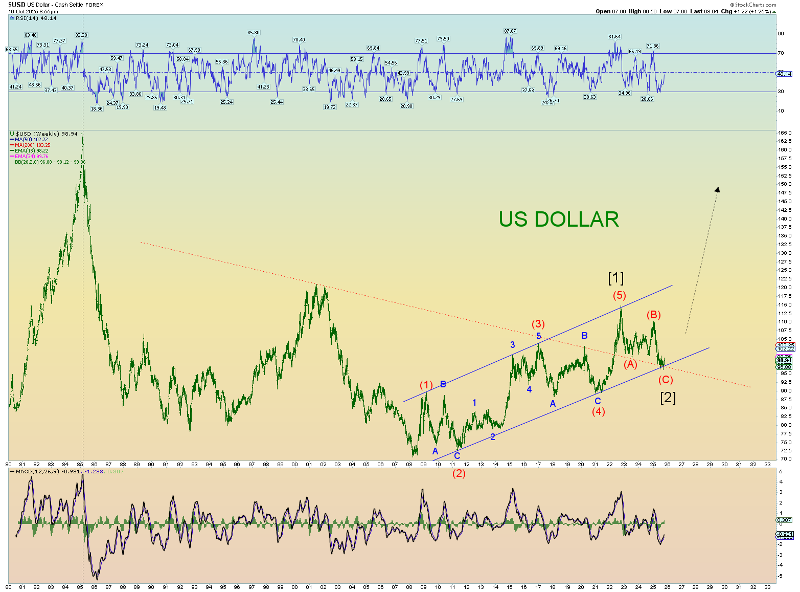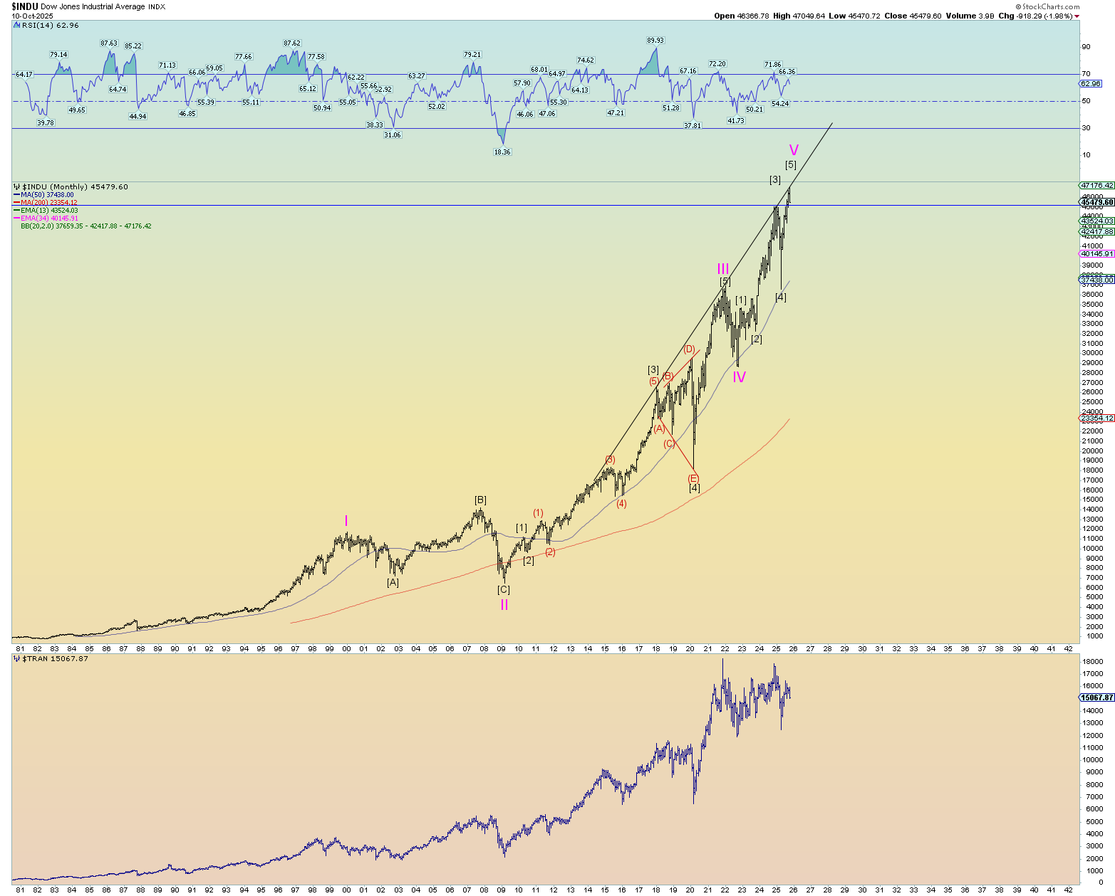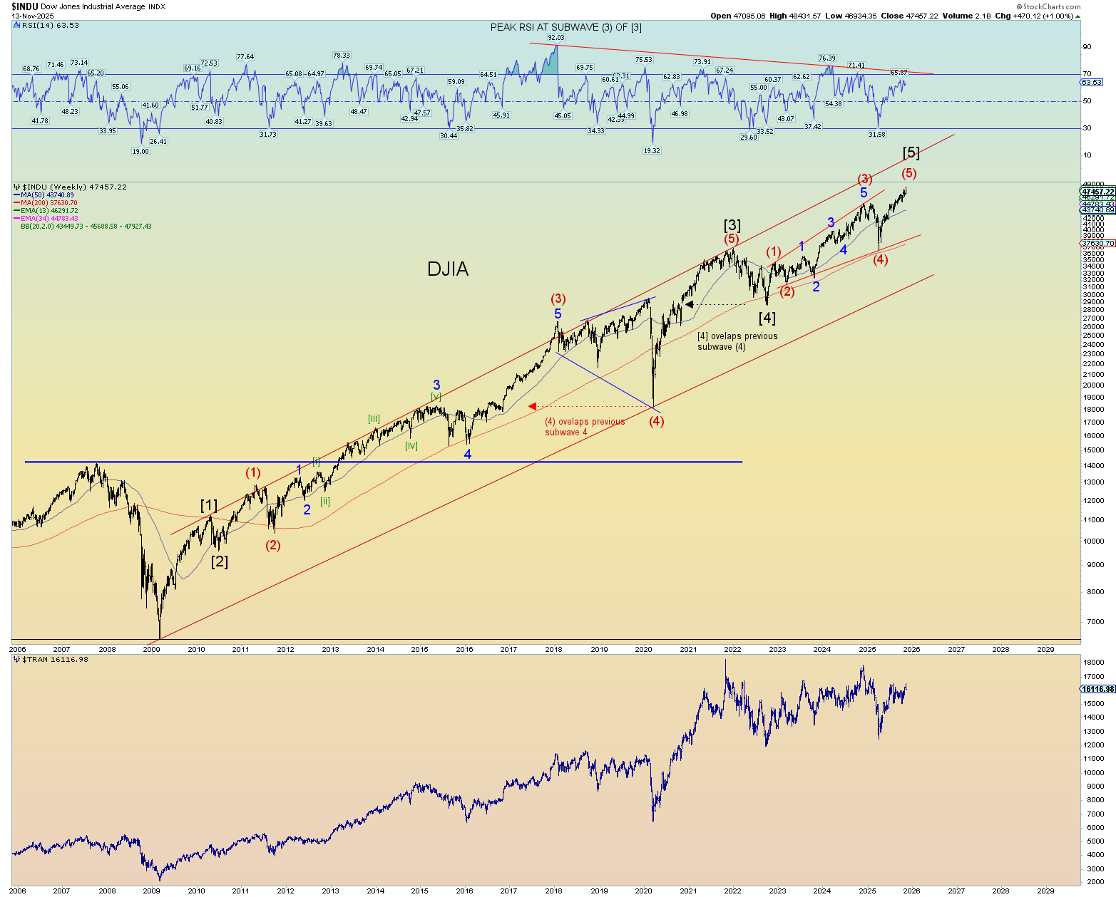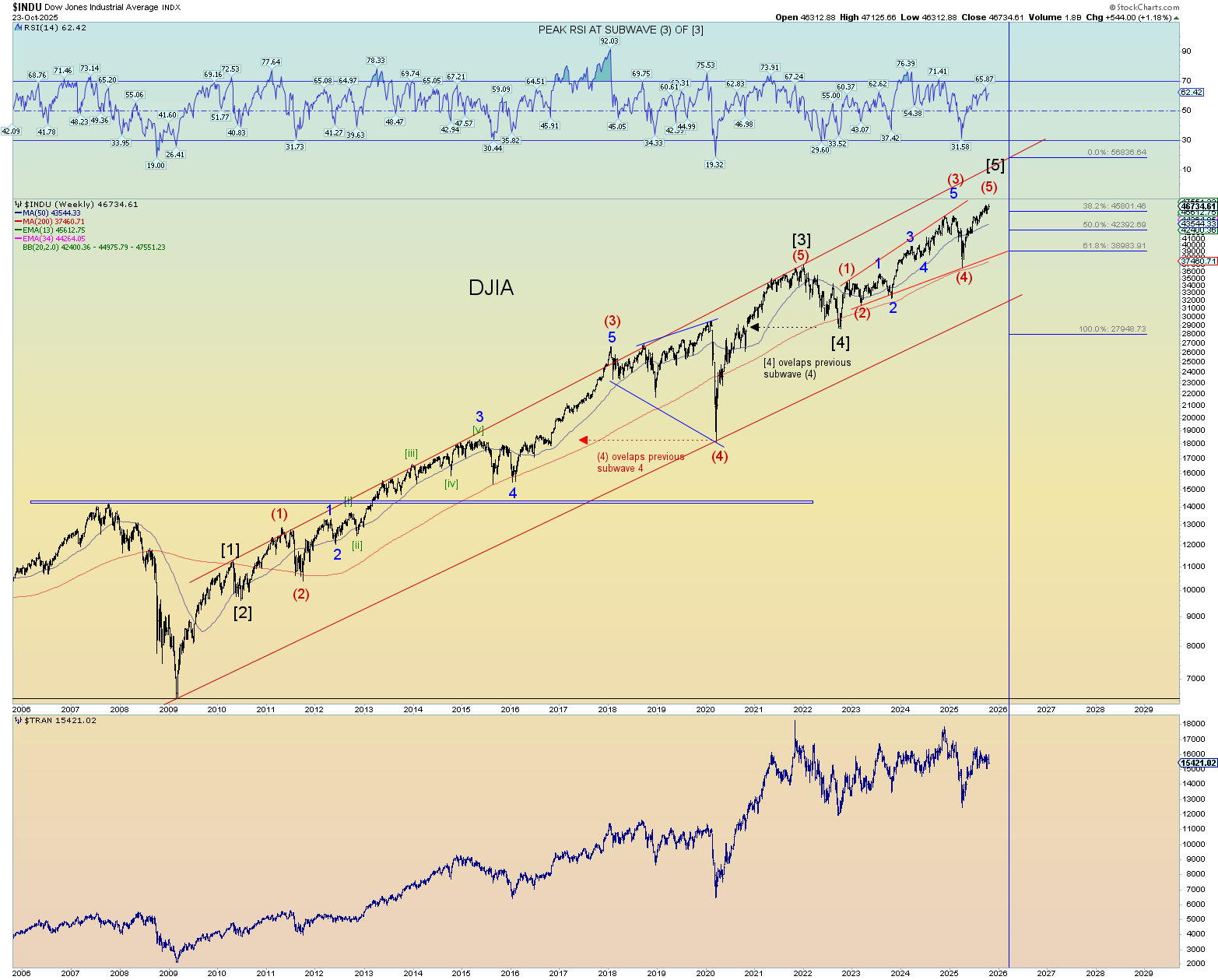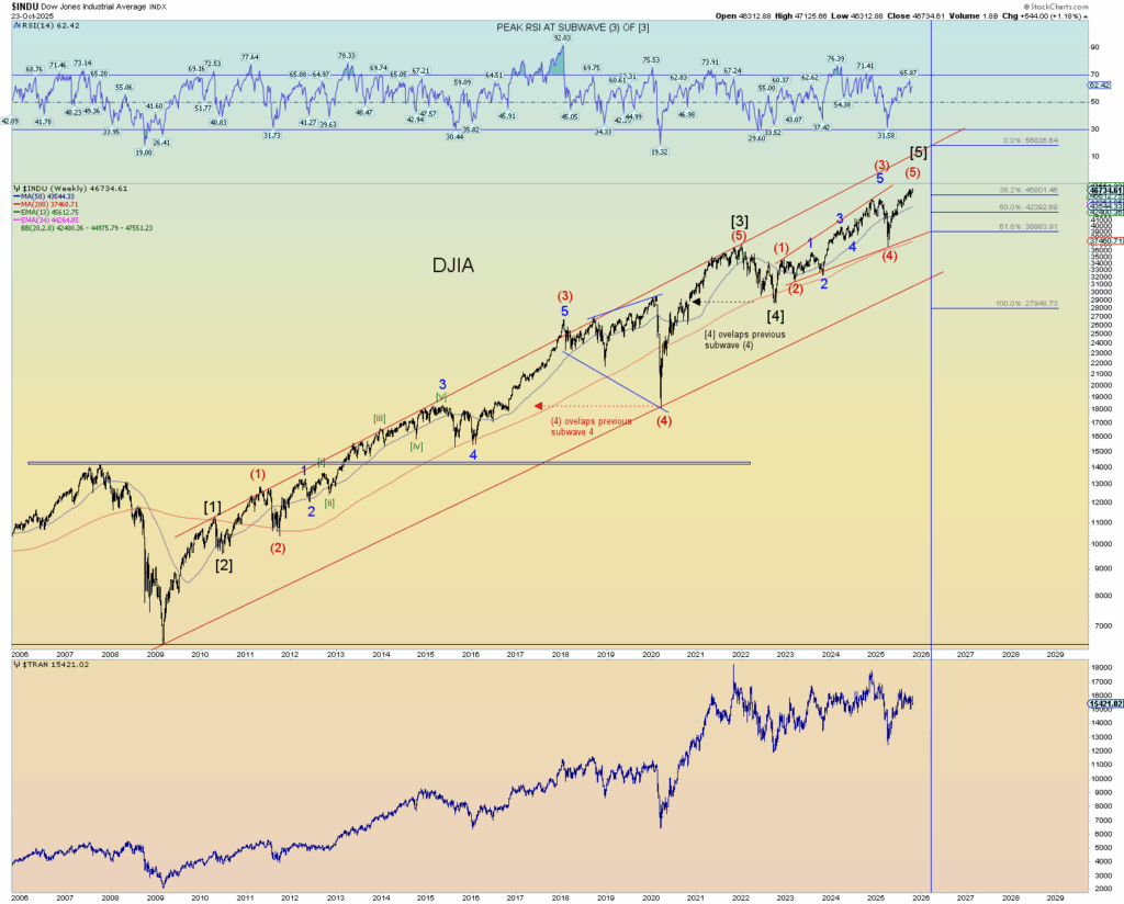Otherwise, it’s just a ghost target never reached which could very well be the case since many, if not most times, wave “fives” do not reach this upper trendline.