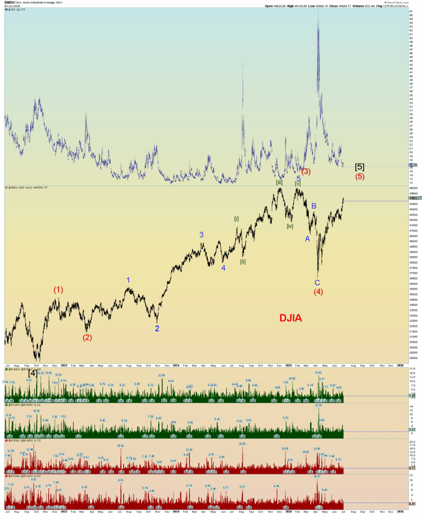 But as of today, there are enough waves in place to consider the count complete. Does that mean I think it is complete? No, likely the market will melt up as there is no more resistance. Yet the DJIA still has over 900 points to go to match the SPX and NASDAQ in achieving a new all-time high. It is a fractured market and often that is a bearish trait.