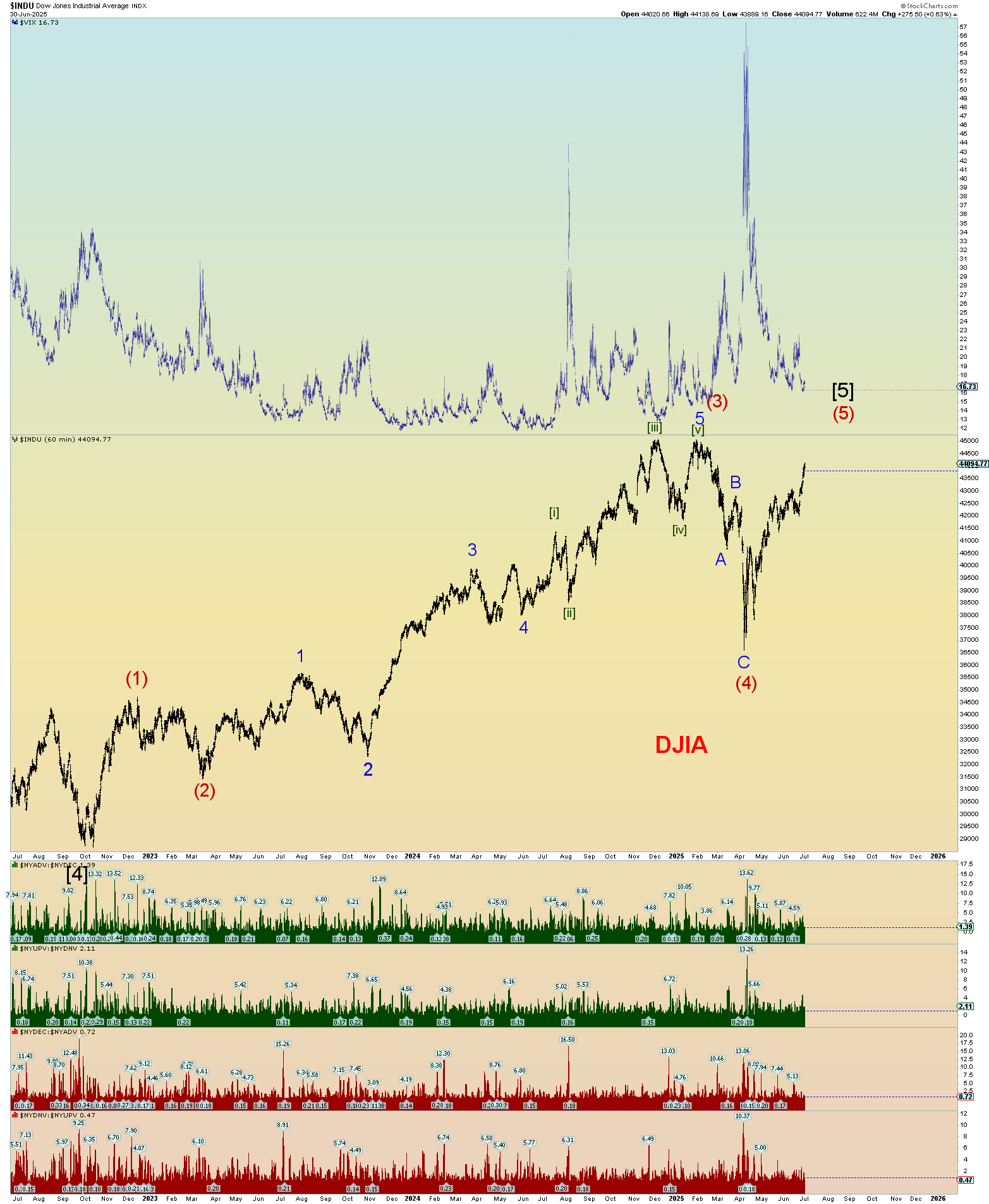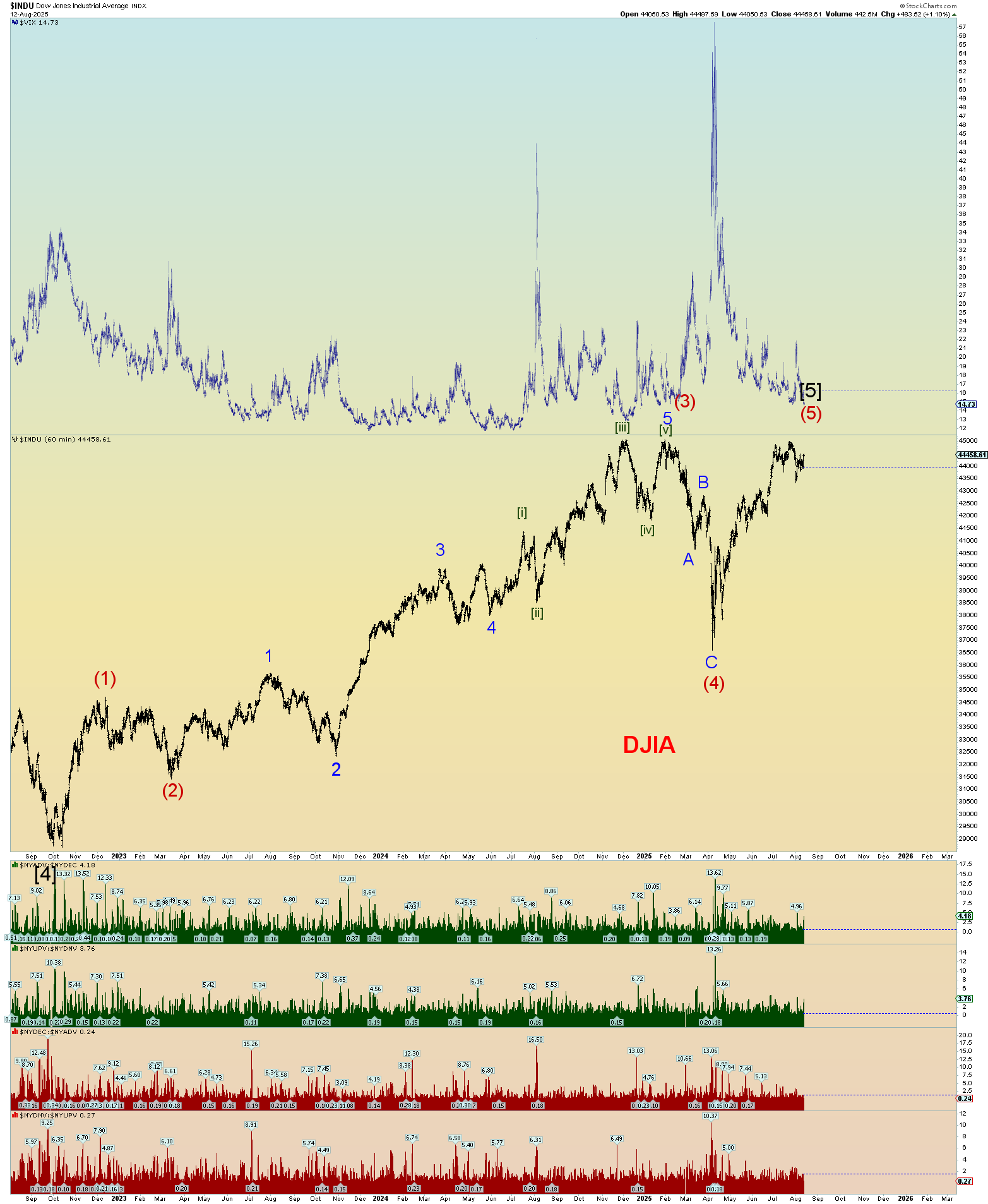 I don’t know where the (5) of [5] will end up so I didn’t bother to move it. Again, this shows the struggle with the 45,000 level. If it is victorious, we could have market mayhem blowoff top as I stated above.