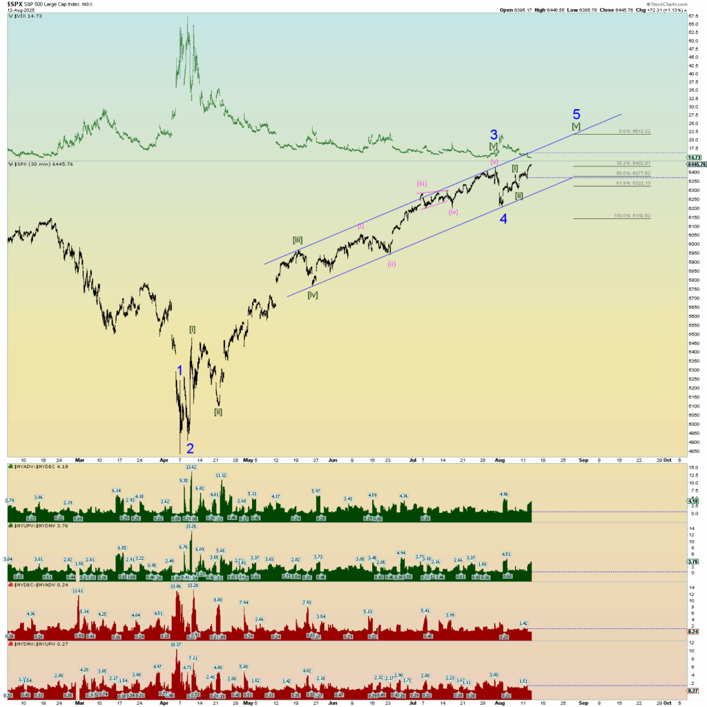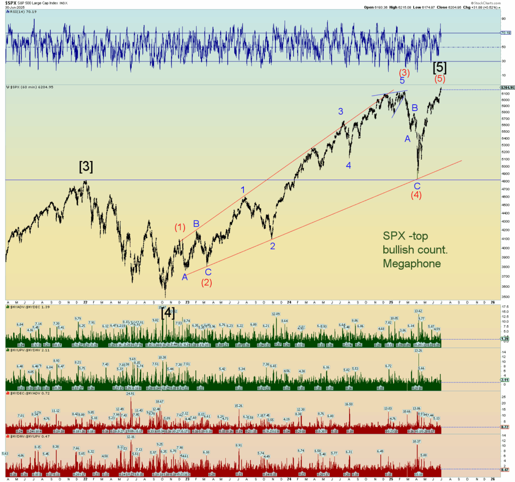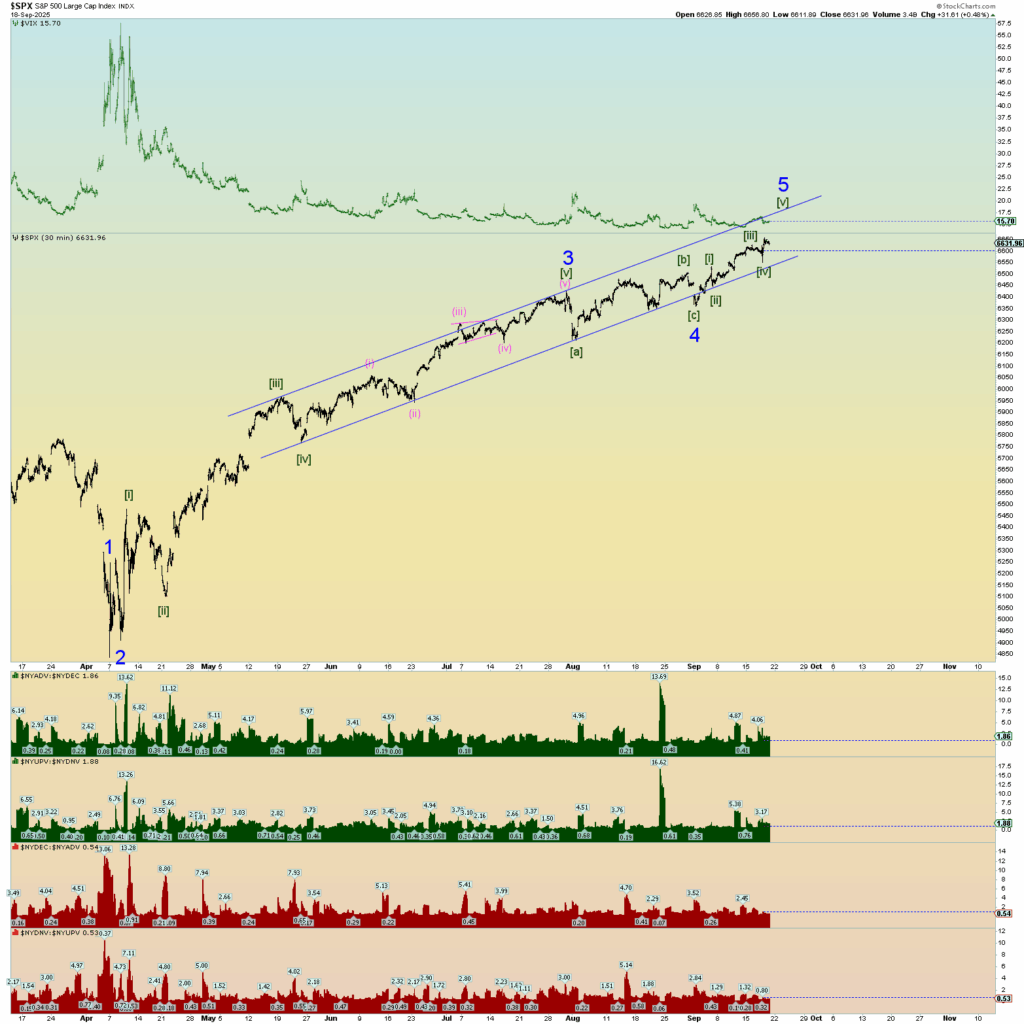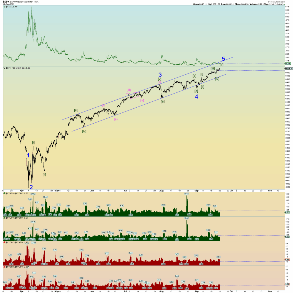 Market internals on the NYSE were monster as you can see in the graphs at the bottom of my SPX chart. An absolute monster 90% up day in both volume and number of stocks up verses down. This is actually probably bearish herding behavior nearer a top rather than a “kickoff” to something very long-lasting. However, this top to end all tops could get crazy. Hang on for the ride. When the AI bubble pops and everyone realizes it all at the same time, it’ll be a mad dash to collect profits.
