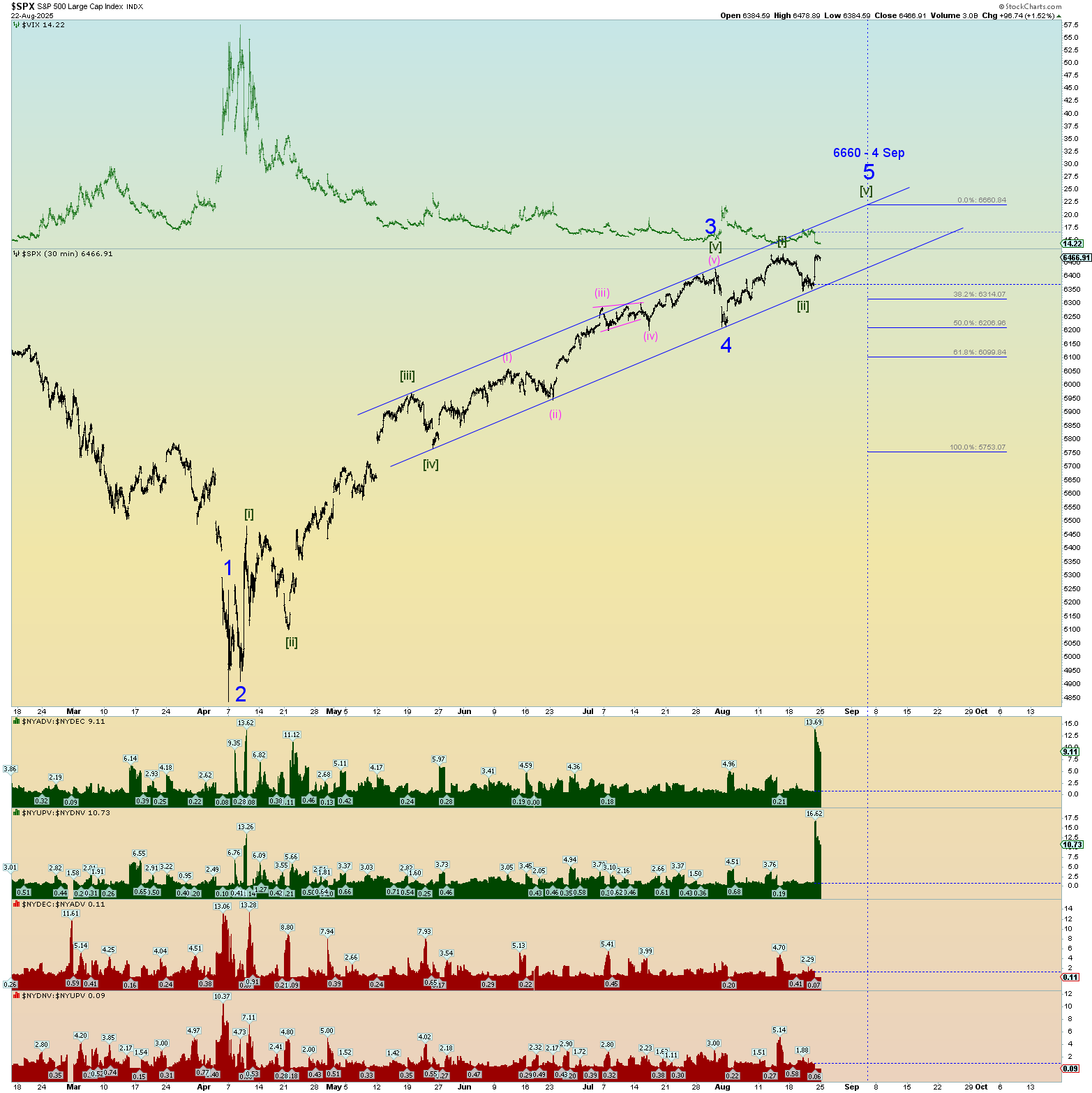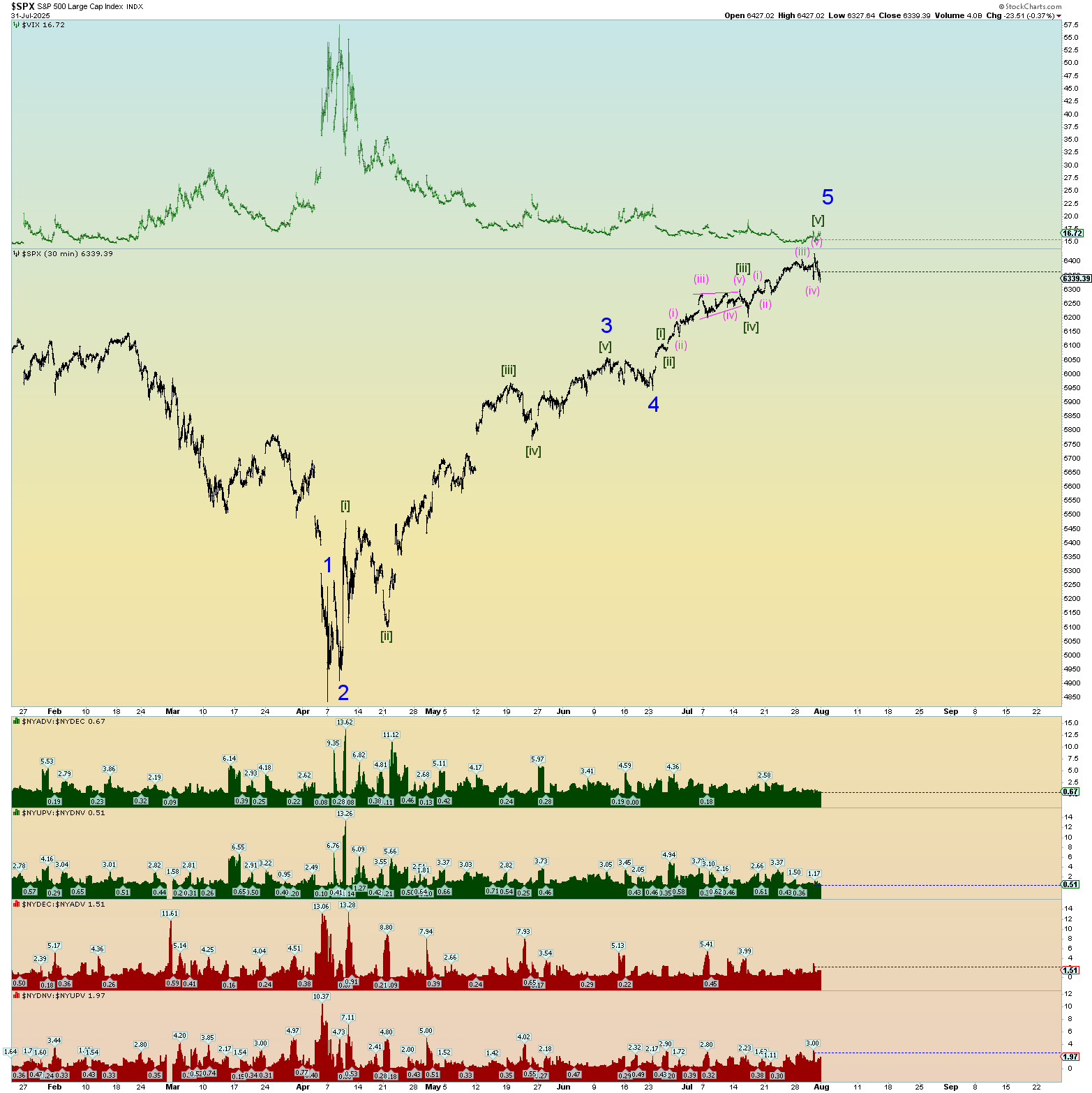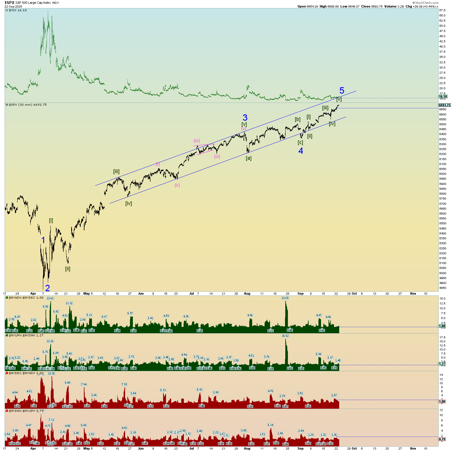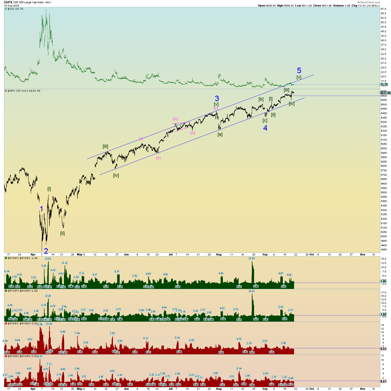 Market internals on the NYSE were monster as you can see in the graphs at the bottom of my SPX chart. An absolute monster 90% up day in both volume and number of stocks up verses down. This is actually probably bearish herding behavior nearer a top rather than a “kickoff” to something very long-lasting. However, this top to end all tops could get crazy. Hang on for the ride. When the AI bubble pops and everyone realizes it all at the same time, it’ll be a mad dash to collect profits.
