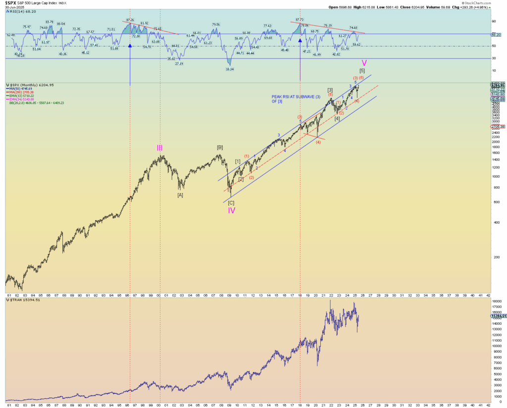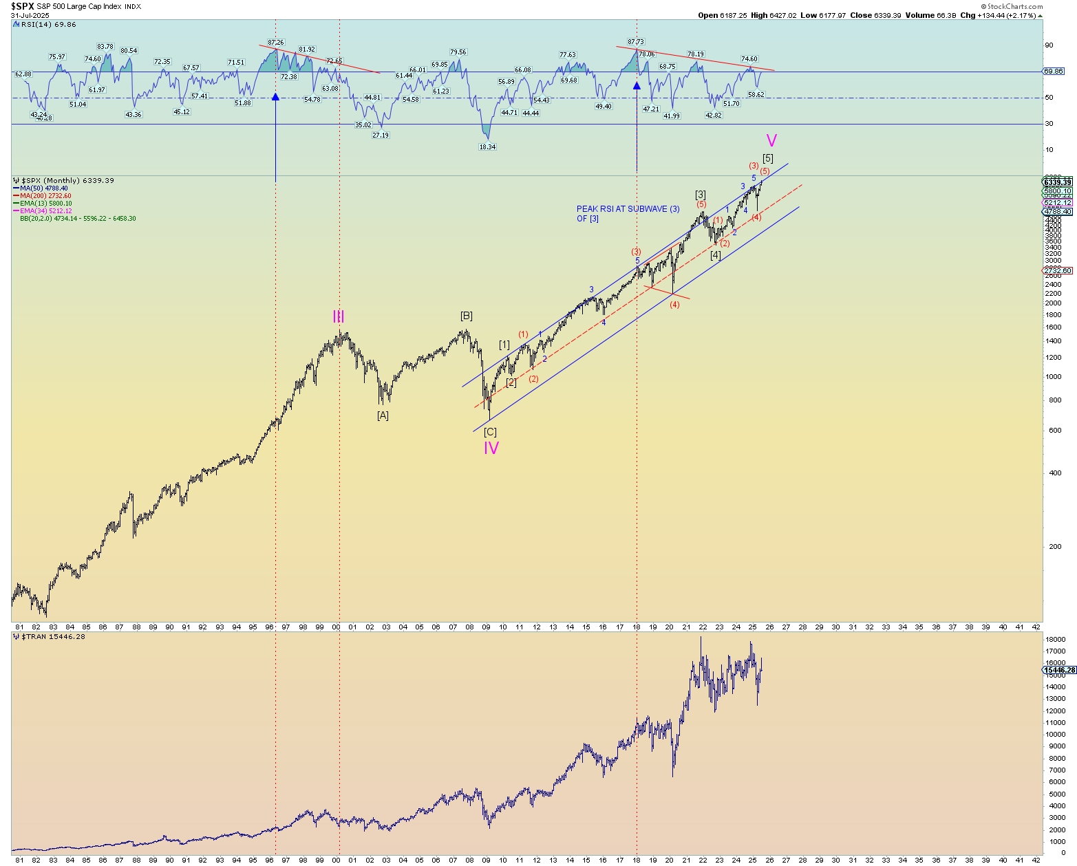 Just looking at simple trendlines, if the market were to hit this long term upper trendline, we are looking at SPX 6350 = 6450ish. This seems likely.