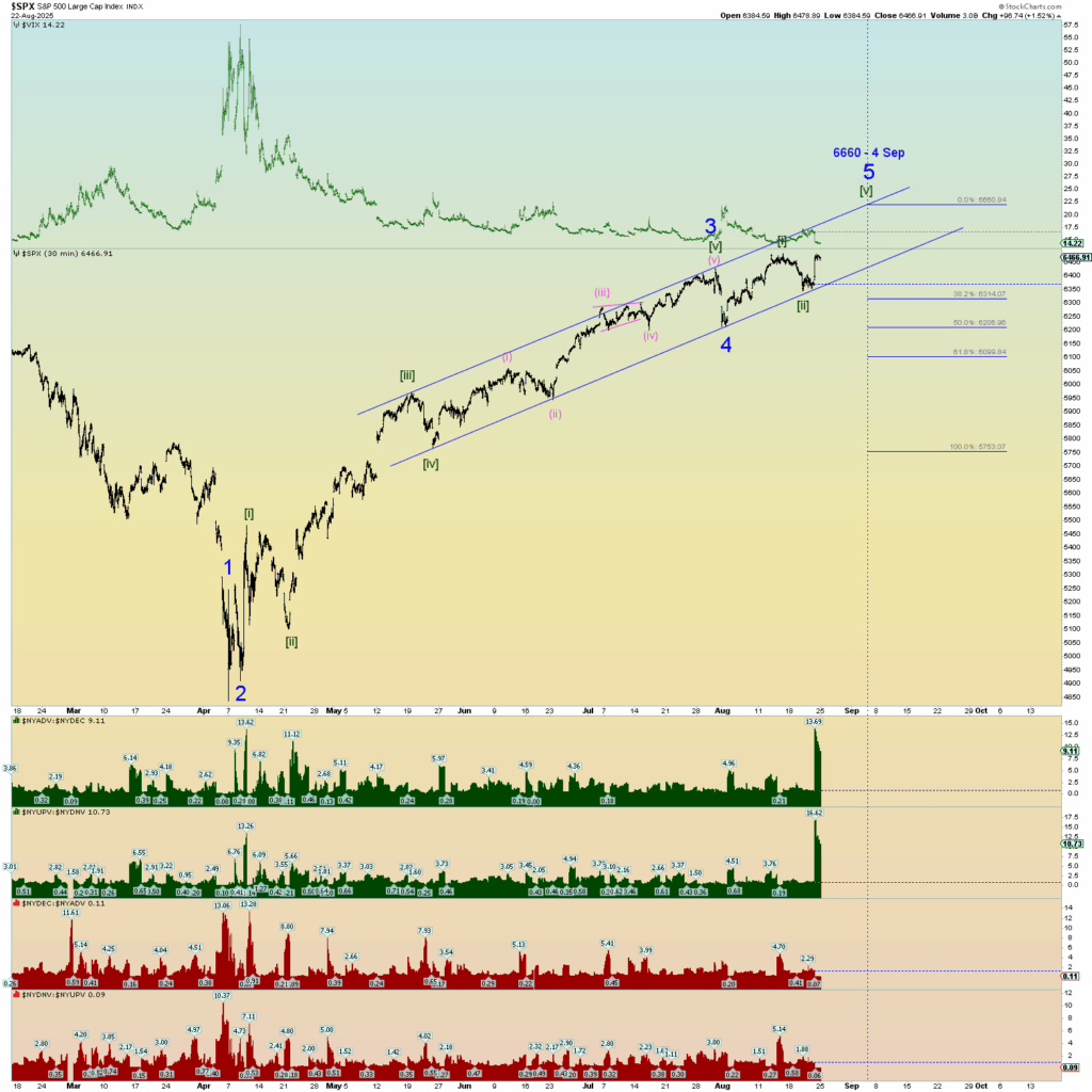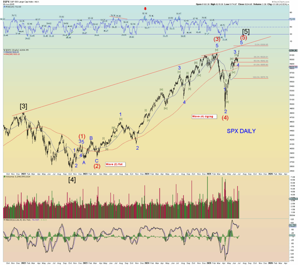 There are probably 5 valid ways to count this massive surge since the April lows and I have adjusted to what seems best at the moment. A clear channel line has been established and I assume another upper strike will occur – my best guess is 6600 SPX or slightly north of that marker in late August. Lets go with that for starters.