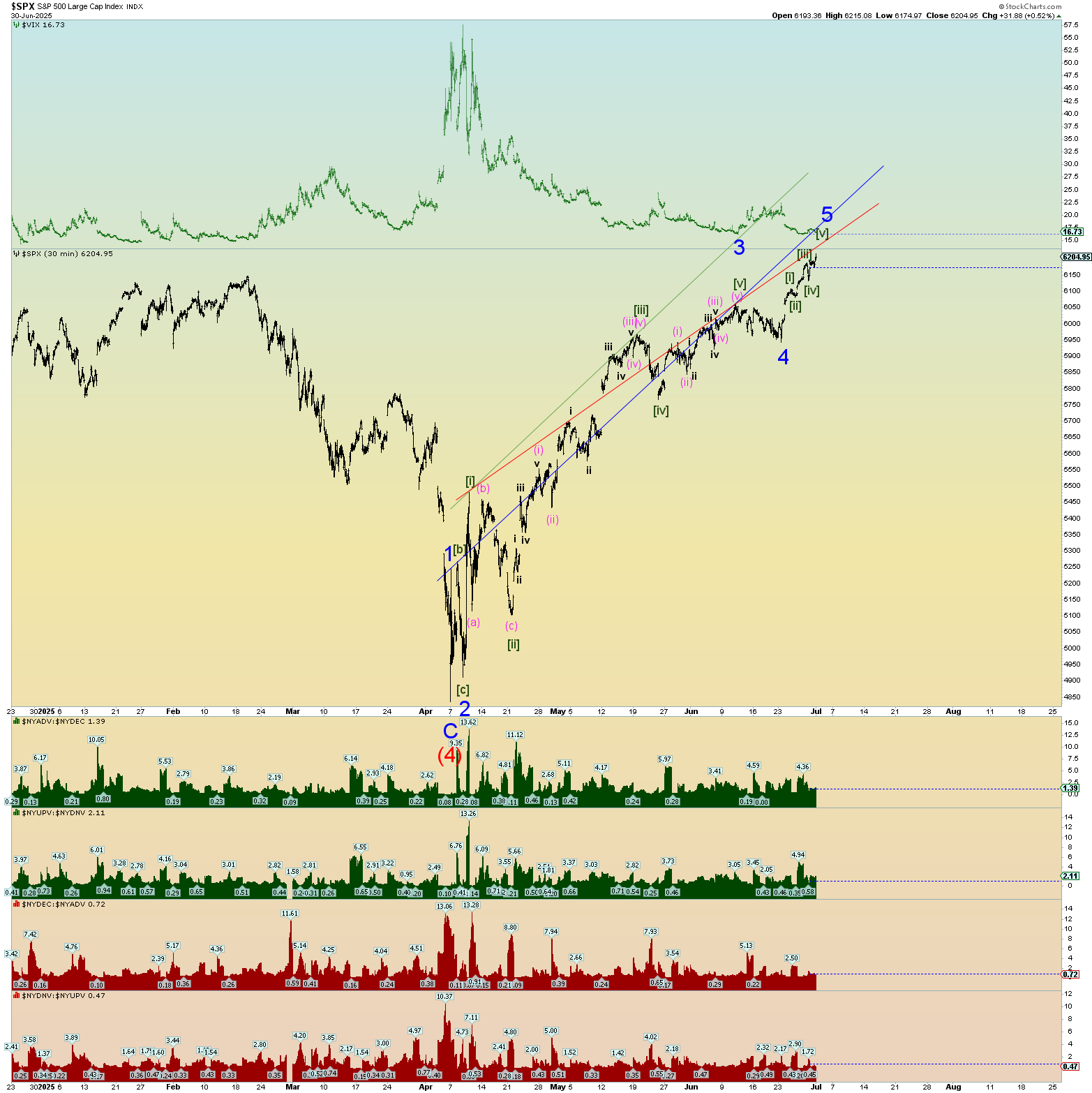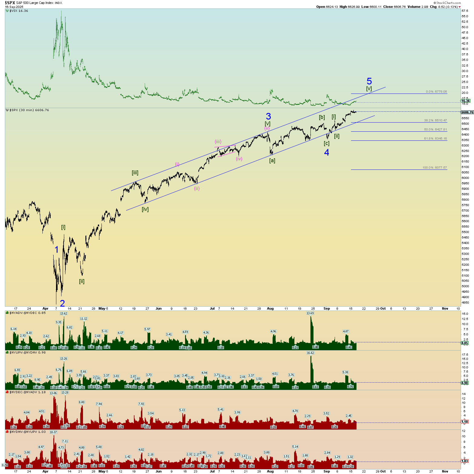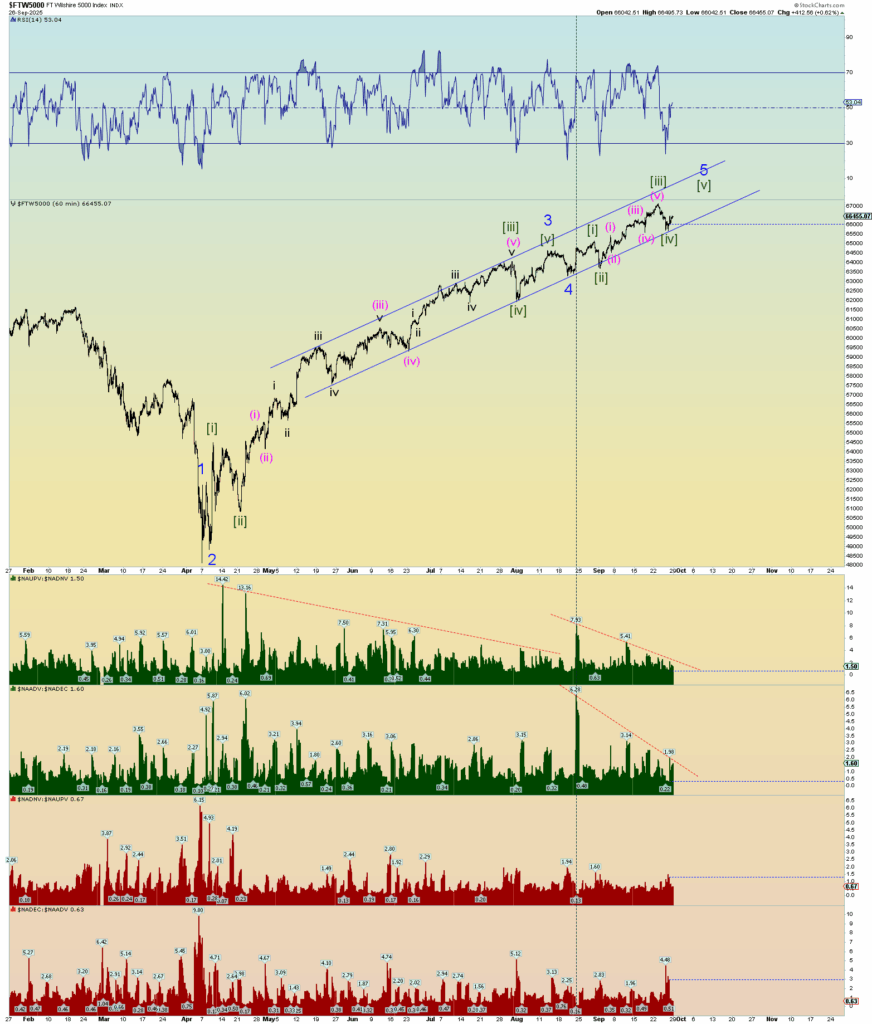 The following chart uses the Wilshire 5000, a better indicator of waves in my opinion, for the squiggle count since the April 2025 lows. Just looking at things objectively concerning the “best” count, the following chart is perhaps where the market stands as of today.