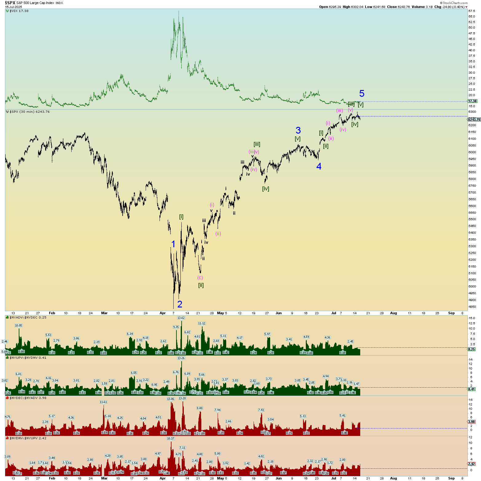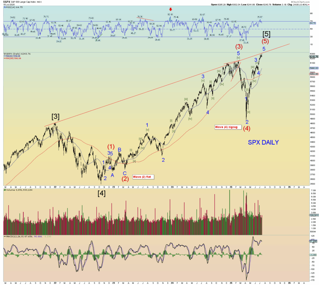 The squiggle count shows that there are already enough waves in place to consider the pattern “done”. However, I’ve probably shortchanged the squiggles in the Minor wave 5… I just wanted to show that Minor 5 of (5) has enough subwaves to be considered mature. We have been following this bullish count since early May. And it has not disappointed.