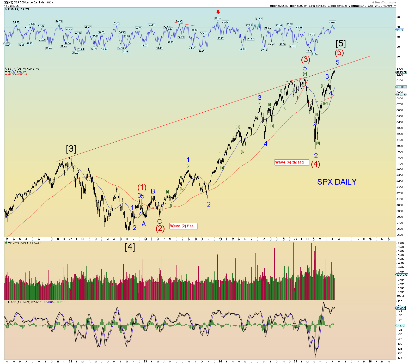 Short term prices are very stretched. Yet it probably will hit the upper trendline which I show at 6300+.