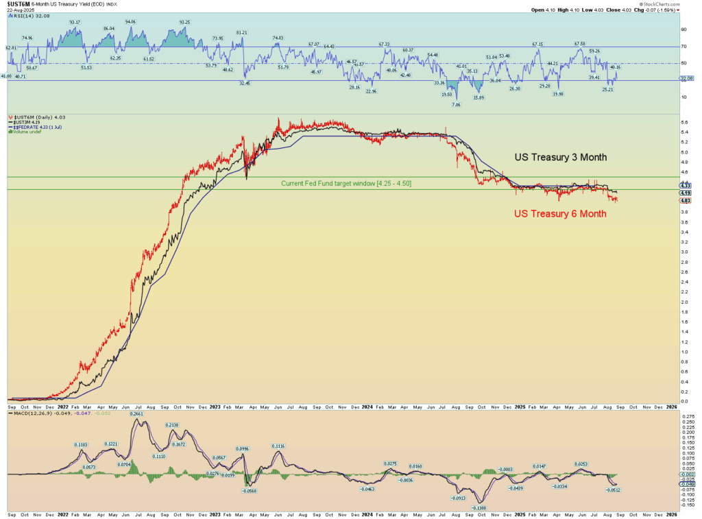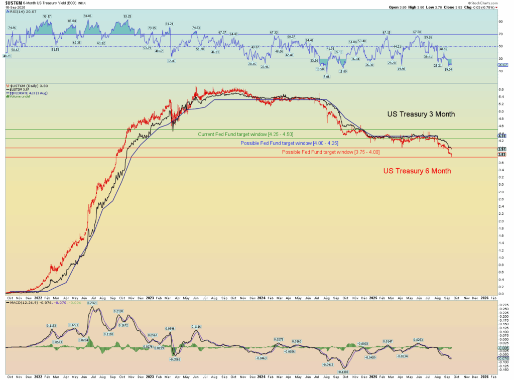 How much will the Fed cut? My prediction is a 1/2 point cut to take the rate window down to 3.75 – 4.00%. This will come as a “shock” to the market because overall consensus is only a 1/4-point cut. But the 3- and 6-month yields have already moved beneath into the next window. So that’s the call. And Trump will like Powell again and call him a genius. Seems fitting.