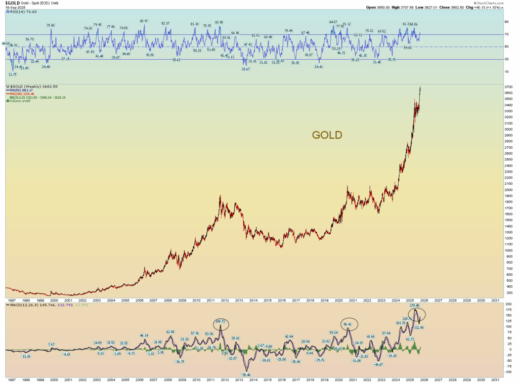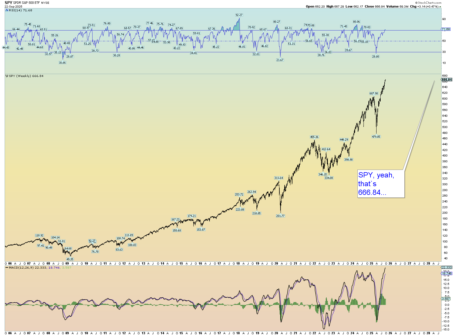 A day late, but finally both the DJIA (24th Fibonacci sequence #: 46,368 – intraday high of 46,396) and SPX (6666.66) hit the targets predicted on this blog back on 22 August, and on the same day which was also suggested. In fact, Friday’s close the SPX finished at 6664.36. Remember the 2010 intraday low was 666.79.
